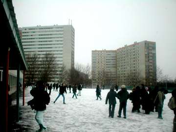 je vois un immeuble grand qui vole dans le ciel au collège Claude Le Lorrain, dans la cité du haut du Lièvre, au-dessus de la ville, une classe est réservée aux élèves qui viennent d'arriver en France, sans connaître la langue - ils sont Kurdes, Tchetchènes, Algériens, mêlés à d'autres élèves de Segpa - leur enseignante de français, Geneviève Colin, a mis en place, en partenariat avec le Centre dramatique national (la Manufacture), un atelier théâtre qu'anime Michel Mayen - on a rajouté au pari de les faire cette année travailler sur leurs propres textes, et c'est ainsi qu'on est là, chaque vendredi de 8h à 10h... aujourd'hui, troisième séance, on a voulu entrer dans l'univers du rêve – est-ce cela qui a provoqué une soudaine tombée de neige sur Nancy ? merci à Michel Biedinger, proviseur, et son équipe –