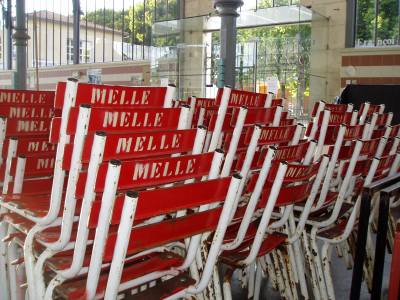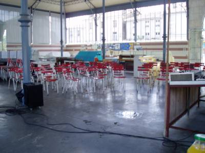 le lendemain, c'est pour Rabelais - parler de sa vie, et de l'oeuvre, à la bibliothèque municipale, le samedi à 15h, et lecture de l'oeuvre carrément dans les Halles, sur la place Jacques-Bujault, plein coeur de Melle, à 18h30, avec les cris des étourneaux, la grande résonance des verrières, le soleil qui décline tout le temps de la lecture (1h la conférence, et 1h40 la lecture...), avec le reste des odeurs de ce temple de l'échange parmi la communauté - parmi les visages sur les chaises rouges, il en est venus de La Rochelle, de Poitiers, et même à moto de Tours