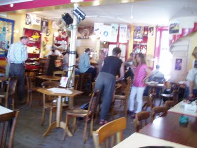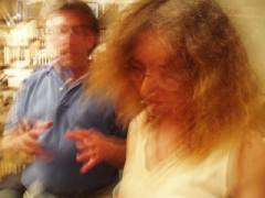 à noter que le café de Stéphane sert aussi de cybercafé, de lieu permanent d'affichage, qu'il y a dans un coin un piano et une sono : ça s'appelle la vie, non ? c'était mon grand et fabuleux voyage à Melle, trois jours durant, et programme lourd – merci aux organisateurs (ci-dessous, elle est pas belle, ma photo tout en flou de Dominique Truco et de Jean-Luc Terradillos ?)