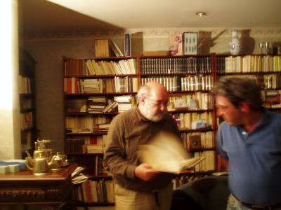 drôle de ville, on longe le soir le bâtiment à peine éclairé de la maison de retraite, on monte un escalier de béton, on suit un couloir jaune carrelé, et vous voilà dans l'appartement de fonction du directeur: verres, chaleur, et les milliers d'ouvrage d'une bibliothèque monstrueuse et folle, une bibliothèque de collectionneur, avec son enfer, ses perles rares, ses dictionnaires étranges, ses réserves d'art : on a toujours tendande, dans nos provinces calmes, à trop se fier aux apparences - résultat, on n'en sortira pas avant 2h du matin, encore le lendemain matin on aura Jacques Polvorinos comme guide dans les rues de la petite ville (lui-même ci-dessous avec Jean-Luc Terradillos, parmi ses livres de découvre la biographie de Roussel par François Caradec, que je cherche vainement chez les bouquinistes depuis bien longtemps, et les Journaux et carnets du peintre Hélion, dont je fais aussitôt la phrase du jour de remue.net)