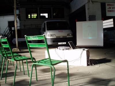 On est vidés le soir, eux et nous, mais le repos sera bref, puisqu'on se rend au garage Renault de M & Mme Guibert, qu'on aménage, chaises, quelques baladeuses sur les outils, un écran, pour qu'à 22h, la nuit tombée, avec projection depuis le Mac, je fasse une lecture de Mécanique. Il se trouve que la route qui passe devant le garage est celle même, la D 136, qui articule tout le livre, si longtemps pratiquée dans l'enfance, et que les odeurs, les objets qui nous entourent sont ceux que cite le texte - plutôt troublé et touché, l'auteur.
