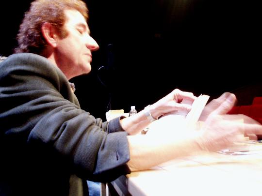 Mais avant, il y a eu Séréna. Jacques lui aussi a amené des livres. Il commence par lire Beckett. Est-ce qu'il lit, est-ce qu'il est "dans" Beckett ? L'attention de la salle , l'appui des lumières, le partage intiié depuis Malte Laurids Brigge, chacun tour à tour aura pris au fond de lui pour une improvisation suspendue que doivent connaître les jazzmen. Après Beckett, il lira Mac Carthy, puis un étrange passage de Brautigan, sur ce gâteau au chocolat "à trois étages" acheté 30 dollars dans une vente aux enchères. A chaque extrait, nous on revisite un petit bout de la vie d'écriture, accès, pratiques, attentes, de l'atypique Séréna (lire Lendemains de fête, un obligatoire du paysage contemporain, ou son dernier Plus rien dire sans toi). Et puis, Jacques Séréna aux mille mains ouvre un livre de paroles des chansons de Lou Reed, puis de Tom Waits, qu'il retraduit à mesure, nous emmène dans une exploration de la notion d'intensité, de l'art du récit maintenu dans le plus bref, pour dire les vies les plus précaires, les instants les plus fragiles: moi je commence à la connaître, le Jacques, et on partagera jusqu'au lendemain matin l'heure du train (il neige, ce 24 octobre, sur Dijon encore dans la nuit), mais – et merci à Minyana, entre nous on ne parle pas comme ça. Il faut ce rituel, ce temps en partage, pour que d'un coup on aperçoive, confié un instant, un autre horizon de mots, qui va nous agrandir, l'engagement en fait qu'on a seul.