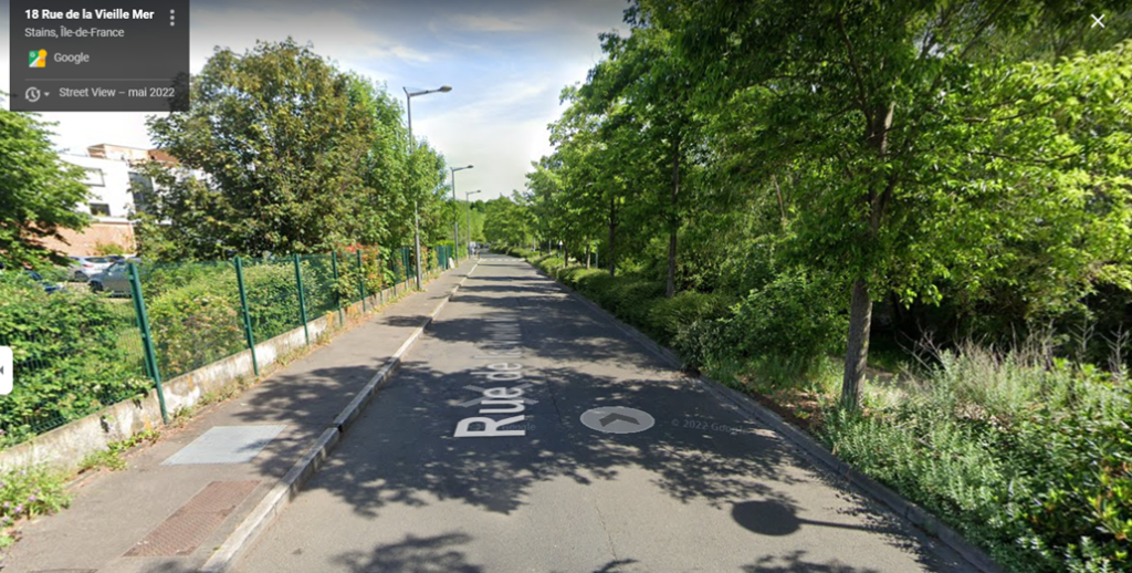 des arbres devant l’espace Angela Davis | la rue de la Vieille Mer bordée de lampadaires – mais pour l’instant, il fait jour | l’ombre des arbres sur le bitume | un trottoir caché par les parterres, un trottoir visible et vide, faiblement colonisé par l’herbe | de l’autre côté de la rue, un grillage accroché à un mur bas prolongé par une barrière de bois épars | vue sur l’arrière d’une école maternelle | cour désertée | aire de jeu sans enfants, toboggan poli, cabane en bois | des fenêtres au rez-de-chaussée de bâtiments sans envergure, rideaux froissés, dessin naïf délavé, escalier en béton et marches étroites | des affiches bleues sur toutes les vitres de l’immeuble de gauche en retrait | si on y regarde bien, un pigeon trotte en vitesse sur la rue, maladroit mais discret