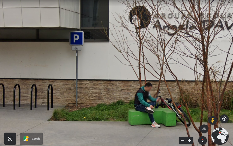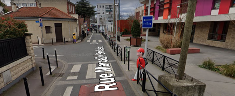 dézoom | une rue étroite sans grand danger | des dos hâtifs, mains dans les poches | rectangles roses et orange sur la façade scolaire | virage à gauche entre les maisons | passages cloutés gardés par Arthur et Zoé, figurines géantes en polyester pour inciter à ralentir à l’approche d’une école, casquettes et blousons couleurs vives, corps en mouvement de marche, sac à dos « merci » – Google a flouté leurs visages.