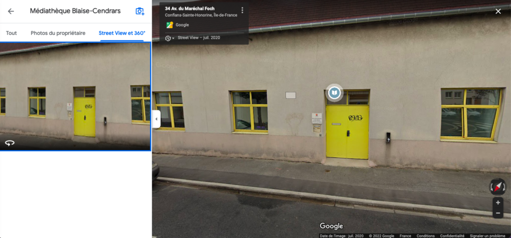 Mur de ciment fatigué, cicatrices d’une ancienne plaque à côté de celle qui annonce au moment de la prise de vue l’entrée des fournisseurs de la bibliothèque. Les huisseries sont jaunes et grandes, la porte est pleine, doubles battants métalliques, mais encore jaune, avec un tag sur celle de droite. Porte de service, une entrée secondaire pour la lecture