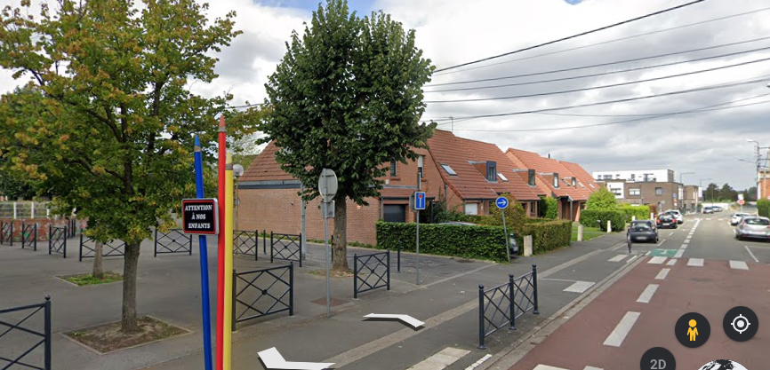 Délimitant l’école publique, sur l’avant, trois frontières : d’abord un fin trottoir, ensuite la piste cyclable susmentionnée, enfin la portion de route qui rejoint la droite de l’image. Cette dernière, au niveau de l’’école, a été soigneusement pensée pour sensibiliser les automobilistes aux allers et venues des petits écoliers. En effet, le macadam a été peint en rouge sur les quelques mètres en face de l’entrée en y ajoutant une marge de manœuvre sur les extrémités (je ne sais pas si les véhicules peuvent circuler dans les deux sens). Deuxième précaution : très exactement en face, cette fois, un panneau préventif, « Attention à vos enfants », enrobe un bouquet de trois grands crayons-poteaux – bleu, rouge et jaune (le plus petit). En vérité, ces crayons sont la première chose attirant le regard, dans ce quartier, mais j’ai tenté d’écumer l’espace depuis l’arrière-plan gauche jusqu’à l’avant-plan droite.