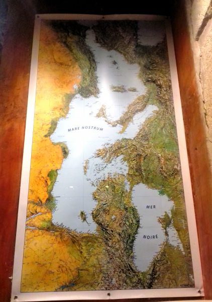 j’ai repris les diverses contributions, j’en ai extrait les questions, elles sont là (pratiquement toutes) – ce n’est peut-être pas exactement l’enjeu de l’irruption de la fiction qui (me) semble être le moteur (maître-mot) de l’atelier (avec ville) quarante jours (le tour du monde en quatre-vingts : on n’en fait que la moitié donc – hémisphère nord) – il y a dans le couloir qui va à la chambre, ici, aujourd’hui, mais depuis quelques temps, une carte de cette mer