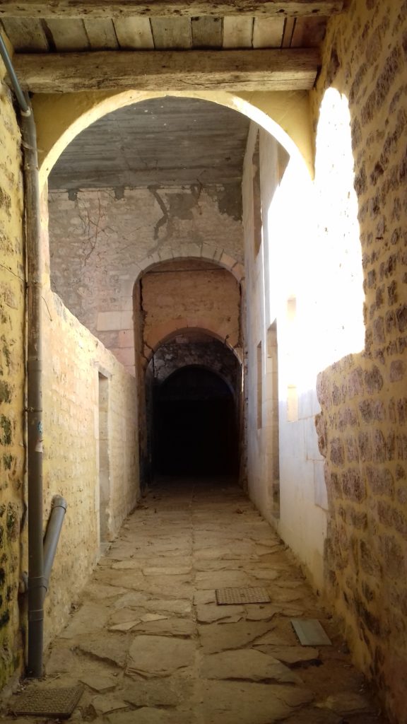 (Et devant la fosse, au pied du mur, une ouverture, demi-cercle bordé de pavés rosés, orangés, ici et là des taches grises, plus ou moins foncées et verdâtres, une grille semicirculaire et deux battants rectangulaires dedans, scellés par un cadenas jaune, à travers laquelle on n’aperçoit rien d’autre qu’un fond noir, menant peut-être dans les sous-sols de la ville, les souterrains frais du château, comme un passage secret pour courants d’air.)