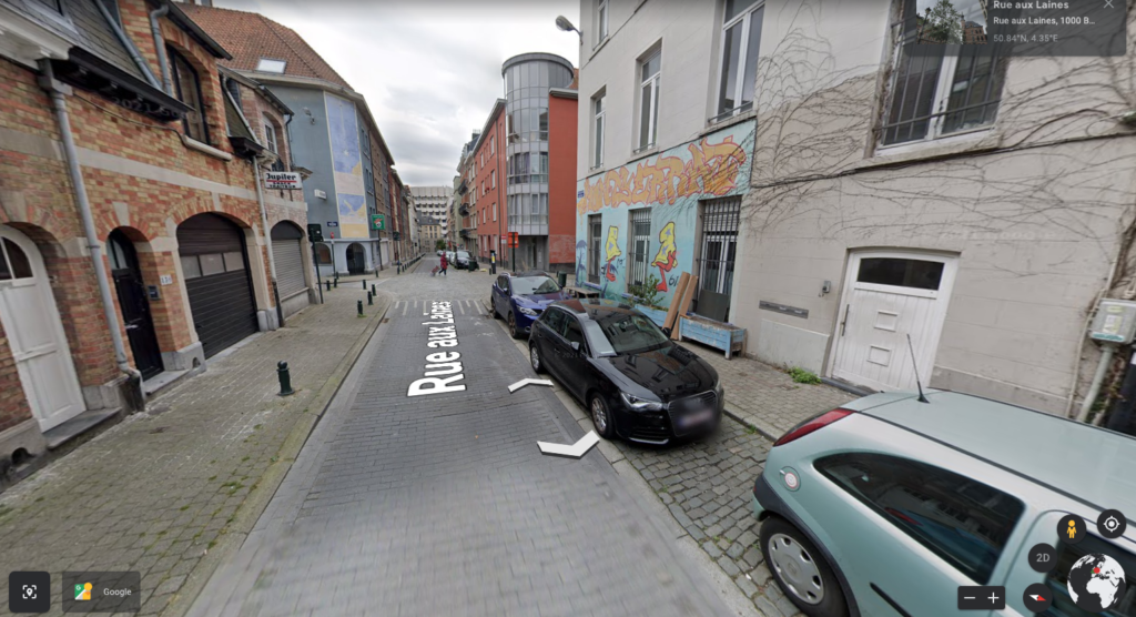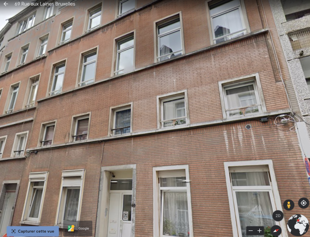 Je n’ai presque aucun souvenir de la rue aux Laines alors que pourtant je passe souvent à quelques encablures de ce que je croyais être une petite rue en contrebas du Boulevard de Waterloo1. Il me semble même que je sois allée dans cette partie de la rue il y a quelques années, mais je n’en ai presque aucun souvenir, voire pas de souvenir du tout. Par contre, j’ai le souvenir d’être allée dans l’autre partie de la rue en 2018, celle que je pensais ne pas connaître et dont un tronçon longe la façade gauche du Palais de Justice, mais je ne savais pas que je me trouvais dans la rue aux Laines. Je n’ai presque aucun souvenir de la rue aux Laines, pourtant je sais que j’y suis allée avec mes parents en visite chez une grand-tante, en 1970-71, je peux donc saisir le prétexte du temps qui a passé pour légitimer ma quasi absence de souvenir. Je n’ai presque aucun souvenir de l’appartement où elle habitait, rue aux Laines, je crois la voir à l’intérieur et j’ai le souvenir, très vague, d’une bonbonnière dont elle m’avait offert un ou deux bonbons. Je n’ai presque aucun souvenir de la rue aux Laines, en réalité aucun de cette partie de la rue où elle a habité. Quand je regarde la rue sur Google Earth, le « presque aucun » trouve son explication dans la perception d’une atmosphère, mais tout est flou dans mon souvenir. Je n’ai presque aucun souvenir de la rue aux Laines où elle a habité avec son mari, un oncle paternel. Une recherche rapide dans un carton de souvenirs de famille, m’a permis de retrouver le faire-part de décès de cet oncle (je savais qu’il se trouvait dans cette boîte) où était mentionnée son adresse précise que je me suis empressée d’aller voir sur Google Earth, mais cela n’a éveillé aucun souvenir.