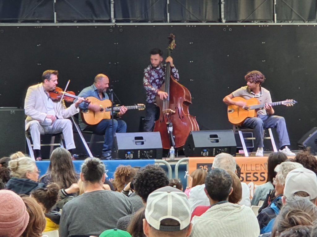 « hôtel de ville » point central et très animé en ce soir de juin. Un festival de jazz s’y déroule. Une scène est installée le long du boulevard, et des rangées de chaises blanches et humides lui font face. Sur la scène 4 musiciens y jouent du jazz manouche. Les lumières de la ville et des rangées de spots s’y reflètent sur leurs instruments. Ils sont animés de la passion de leur art. Violon, guitares, contrebasse. Les spectatuers y boivent avec avidité les notes qui s’échappent de leurs mains mates d’artistes vituoses.