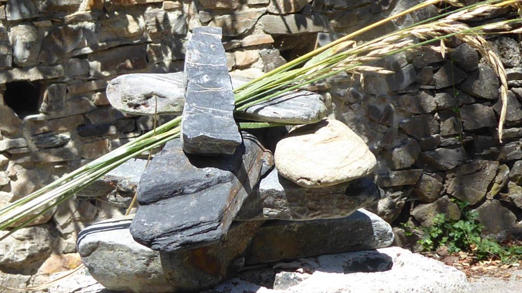 pas d’idées | je coince, je bute, je me répète les mots « agir sur le réel » mais quoi faire | marcher en direction des jardins où je pourrais construire des édifices provisoires capables d’interroger, d’attirer le regard | il y a bien ce rebord de trottoir, cette marche qui dépasse pour y assembler trois galets de rivière, ajouter un brin de graminée ou rameau de clématite en travers, semer quelques grains de lavande pour le parfum | je me dis que ça ressemble à rien, il ne vient presque personne sur le chemin, pourtant voilà tableau fragile qui invente un ordre différent, offre prise au vent, se propose au chat curieux ou au chien qui furète | combien de temps ça va tenir avant de basculer s’effondrer | je poursuis ma cueillette, positionne ci et là d’autres assemblages éphémères, espèces d’alignements au gré de quoi me tombe sous la main (j’ai toujours adoré les herbiers) : feuilles, fruits, cailloux, graines, fleurs | combien de temps ça va tenir, bien peu sans doute avant d’être gratté par les poules, dérangé par les fourmis voire transporter, avant même d’être remarqué par un passant, avant même de pourrir s’évanouir s’anéantir | prévu au protocole une autre séquence photo dans une heure, puis dans deux, demain il ne restera rien | je viens d’aller voir : l’étoile en pierres tient toujours mais les fleurs mauves dessinant un carré ont déjà disparu dans un souffle de vent