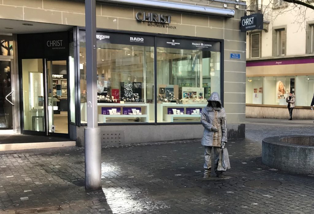 La porte automatique s’ouvre sur la pleureuse. Elle demeure immobile au milieu du va-et-vient. Une femme porte son bébé devant elle. D’autres gens. Certains dans l’ombre d’autres en pleine lumière. Une vitrine et le scintillement des bracelets. Christ. Un peu d’eau encore sur les pavés. Un poteau.