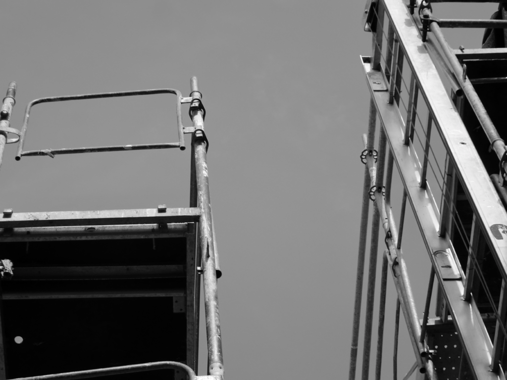 L’échafaudage dressé vers le ciel bleu pâle du petit matin le long de la façade sur cour de la maison mitoyenne, un homme de profil sur les planches au niveau du premier étage, une main sur un seau posé sur l’appui de la fenêtre devant lui, torse penché en arrière et visage tendu vers le haut, une corde qui pend depuis la corniche, un visage qui apparaît hors de la fenêtre du second, une main posée sur la corde, un cri qui finit de résonner, un suspens avant l’effort.