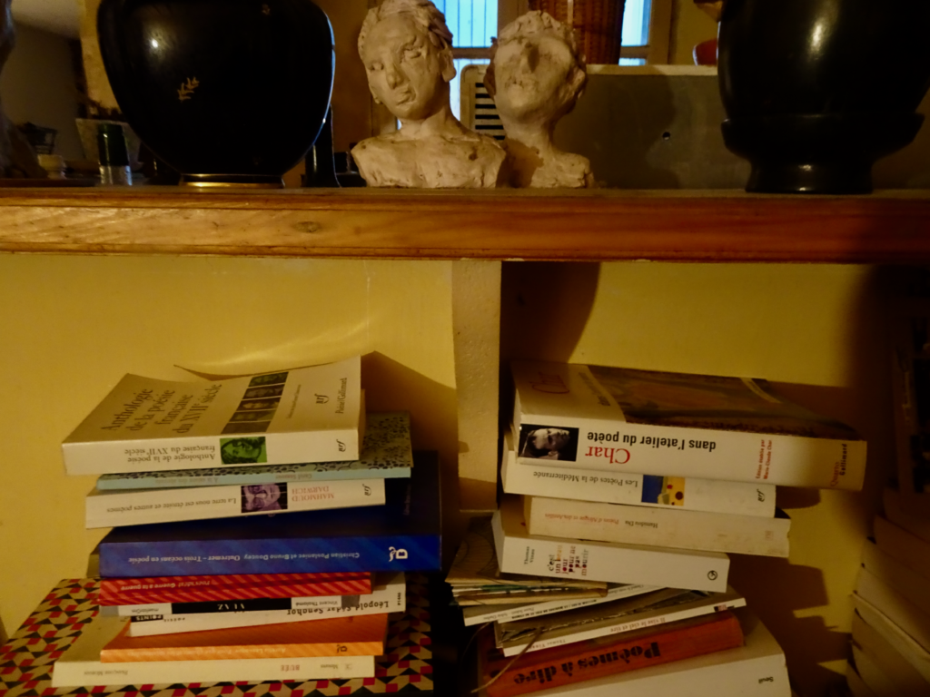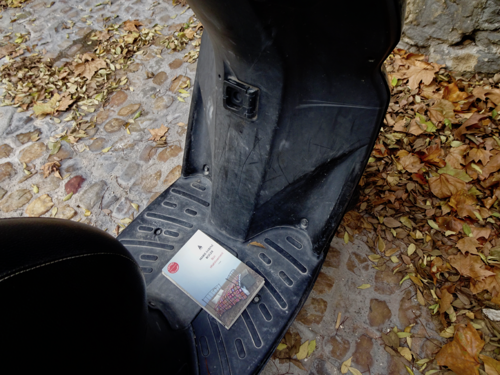 Dénicher derrière livres aimés indispensables, gardés et poussiéreux ou se délitant ou griffonnés, autres livres honteux mais familiers, un livre offert oublié et intact | ne pas sentir besoin impérieux de la découverte | oui le perdre | mais comment lui donner une chance dans mon quartier | ni libraire ni autre boutique ou entrer sauf boulanger inconnu et décorateurs | terrasses non encore en place… opter, avec fol espoir d’adoption, pour un scooter garé devant le rempart.