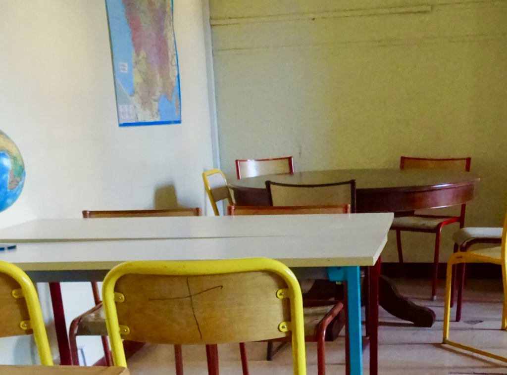 La lumière franche qui semble légèrement dorée comme un souvenir du soleil, le calme, les voix qui murmurent presque et la douce surprise de la chaleur qui accueille et caresse. La nuit froide et humide restée derrière la porte vitrée. Quatre tables studieuses, quelques chaises en vadrouille et une table aux piètements métalliques et plateau blanc où poser sac, manteau et fesses. Le mur blanc en face et un grand tableau noir aux lettres mal effacées. Une pause avant réunion.