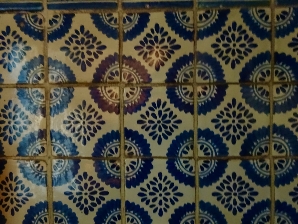 Taillant dés de courge, rondelles de radis vert et carottes face au carrelage du mur, je vois des cercles bleus sur fond vieux blanc encadrant un carré en biais ou plutôt des carrés en biais encadrés de 4 quarts de cercle ; il y a face à moi 4 rangs de 14 carreaux et sur les deux murs latéraux, en retour, 4 rangs de 2 X 6 carreaux, soit 124 carreaux et en frises deux rangées de 14 + (2 X 6) rectangles soit 2 X 26, 52 rectangles… les légumes sont prêts, je pose mon couteau.