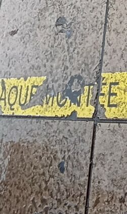 Où m’entraînèrent les déchirures de la bande signalétique jaune de la chaussée à l’emplacement du tramway Plan Cabanes à Montpellier.