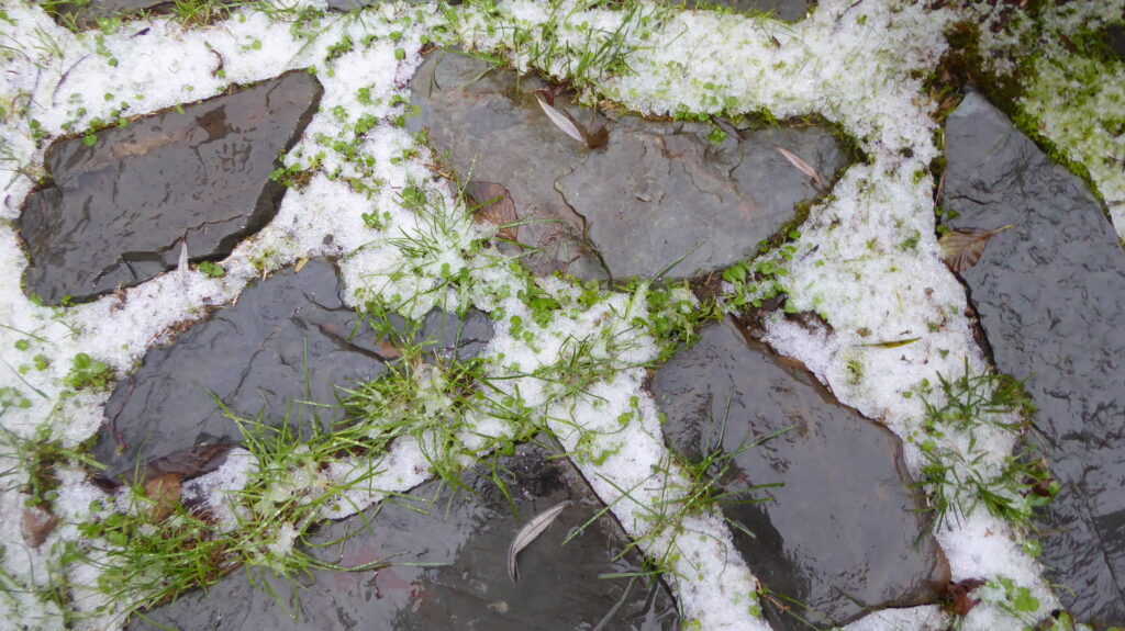 De ces cristaux de neige en train de fondre dans l’allée, on peut en faire toute une histoire, de ces cristaux photographiés au lever du jour alors que la chatte hésite à s’aventurer inquiète du paysage changé, on peut en faire un mortier d’hiver pour décrire la vie du jour d’autant qu’une petite pluie retient l’animal sur le seuil et m’implore de ne pas glisser dans l’escalier, et si malgré tout je m’engageais dans cette voie, tout du récit serait modifié, je surprendrai un sanglier sous les aulnes nus ou un renard près du poulailler, je verrai la fumée s’élever du chalet voisin, une nouvelle aventure commencerait, 480 signes là où mon regard s’arrête — j’ai déjà dépassé.