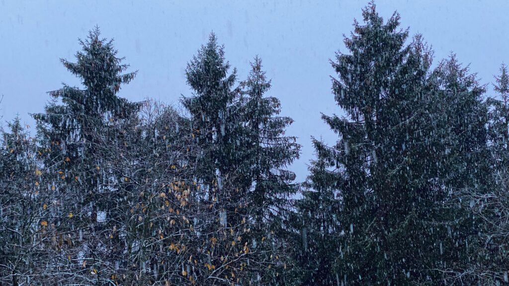 Dehors. Temps froid et sec, lumière sur les montagnes, on y voit vraiment loin, détails dans les sapins, reliefs soulignés d’ombre. Pas un nuage en vue, juste un peu de buée quand on souffle sur ses doigts.