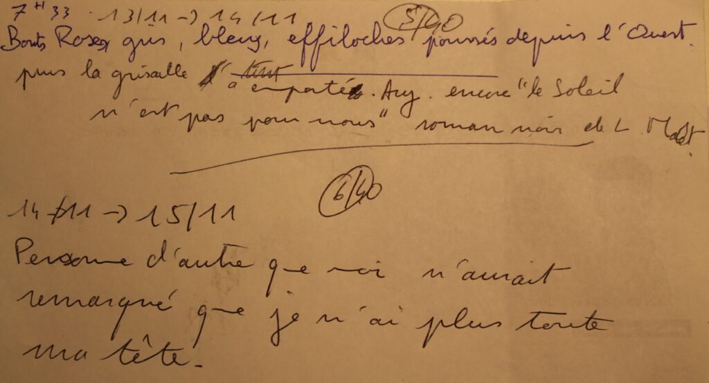 pour ton travail de notes pendant 40 jours, guette l’imprévu, ce qui flotte aux souvenirs, ce que tu aurais dû, ce que tu peux arracher à tes rêves/cauchemars, les couleurs et les formes du ciel, ce que toi seul·e remarque, les têtes, les patronymes et les toponymes croisés, ce sur quoi tu préfères ne pas t’attarder, ce qui vient pendant que, les cartes de ta vie, le dessous de la grisaille, quand tu arrêtes le monde, les images mouvement, les bribes de paroles, les habits, ce qui peut embellir ta ville, tes lectures, toi vers les autres, toi avec de l’argent, tes gestes de rien, tes actions sur le réel, tes paysages, toi qui attends, ton corps — ton corps fragment, ce qui est net et ce qui est flou, quand tu te vois vivre, ce qui te mâche, ce que tu n’aurais pas dû, les faits divers, ce que tu ne peux pas ne pas dire du monde, la présence de tes morts, comment tu vides ton dedans de toi, ce que tu aurais pu lire chez tes préféré.e.s, quand tu cherches un mot, ton comment lire/écrire quotidien, ces phrases qui t’empoignent à la lecture, quand tu rêves/cauchemardes, tes secrets, les conseils ami.e.s