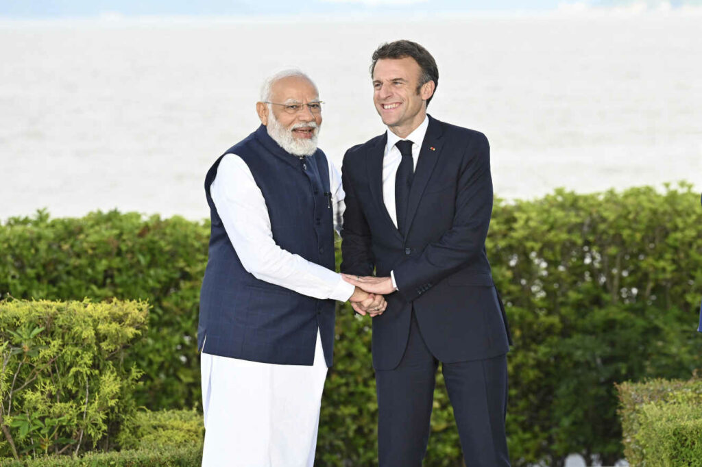 (trad G)Le Premier ministre indien Narendra Modi, à gauche, serre la main du président français Emmanuel Macron, à droite, après la photo de famille officielle du sommet du G7 à l'hôtel Grand Prince, à Hiroshima, au Japon, le 20 mai 2023. Photo de Pool/G7 Hiroshima /Planète Pix via ZUMA/ABACAPRESS.COM