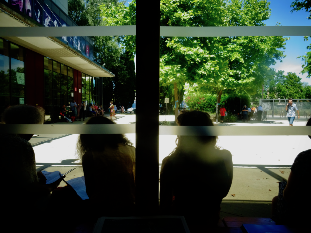 L’enclos de la Fabrica est en feu en ce début d’après-midi. Sur l’un des étroits bancs qui longe la paroi vitrée du hall, Sophie, penchée sur les quelques feuilles de Libération vouées au festival se maudissait d’être arrivée avec si grande avance et tentait de comprendre ce que lui réservait ce « Fraternité, conte fantastique » qu’avait choisi son ami. Elle n’a pas fait attention à la femme qui vient de s’asseoir à côté d’elle