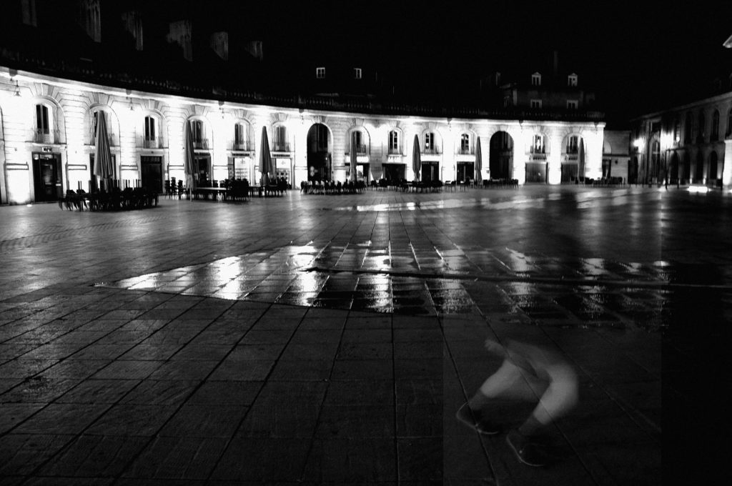 1. L’Ours soulève sa patte arrière et son corps massif s’élance en avant. Face à lui, la Place Darcy où convergent six artères et la Porte Guillaume, un arc de triomphe qu’il franchit gaillardement. 2. Le hall circulaire de la gare est l’endroit idéal pour tourner en rond en attendant quelqu’un.e, sans savoir par quel train il arrivera, sans savoir si oui ou non elle viendra. 3. Par où sont-ils entrés dans la ville… par le Nord-Ouest et l’Ouest sans doute… deux jours avant, la ligne de défense du Canal de Bourgogne avait cédé, les autorités militaires avaient appris la chute de Sombernon et la police dijonnaise avait incité la population à évacuer la ville… ils ont dû arriver par Talant, par Plombières, par la départementale D971… ils ont peut-être descendu le Boulevard de Troyes puis l’avenue Victor Hugo… Toujours est-il que le 17 juin 1940 les tanks de la 4e Panzer-Division ont pris possession de la ville, à quinze heures une dizaine de blindés, d’automitrailleuses et de motos de la Wehrmacht stationnaient devant le Palais des Ducs de Bourgogne. 4. Pour rejoindre son bureau à la grande Poste de la Place Grangier, Victor a le choix entre cinq itinéraires à partir des deux possibilités qui s’offrent à lui au sortir de sa maison. Soit il remonte la rue Paul Thenard par la droite après avoir allumé sa pipe qu’il fumera tranquillement tout au long du parcours et dans ce cas il empruntera plus loin la rue de Talant avant de rejoindre l’avenue Victor Hugo et d’arriver sur la Place Darcy qu’il traverse pour attraper la rue de la Poste qui le conduit naturellement à la Place Grangier. Soit il descend par la gauche la rue Paul Thenard après avoir tassé son tabac et allumé sa pipe car quel que soit l’itinéraire choisi, que le soleil brille ou qu’il pleuve, il profite toujours de son trajet pour fumer une bonne pipe. Ce deuxième choix offre plus d’options. Il peut en effet tourner très vite à gauche dans la rue Phillibert de la Mare, puis de nouveau à gauche sur la rue Charles Brifaut puis à droite sur la rue Thurot et encore à droite dans la rue des Aqueducs. Il arrive ainsi au Jardin Darcy qu’il traverse dans sa longueur avant d’atteindre la place Darcy. Il peut aussi tourner un peu plus loin sur la rue Lamartine et prenant à gauche la rue Charles Brifaut rejoindre l’itinéraire précédent. Ou même aller jusqu’à la rue Amiral Courbet et descendre vers la gare, suivre la rue des Perrières pour arriver Place Darcy et prendre la rue de la Poste mais il n’emprunte que rarement ce dernier itinéraire, plus long que les autres. Quel que soit le parcours choisi, Victor aime faire quelques pas dans le Jardin Darcy, s’il en a le temps, pour aller saluer l’Ours blanc. 5. Il s’est engouffré dans les rues du centre historique à la recherche de poubelles à éventrer au pied des porches où l’odeur des croûtes de fromage, du gras des viandes, des têtes de dorades a creusé sa faim puis sa fureur quand il a découvert ce menu fretin apte à régaler un chaton mais pas à satisfaire son appétit de bête sauvage restée clouée plus de quatre-vingts ans sur une stèle. 6. Dans le bar où il a ses habitudes – est-ce face au virage d’une de ces rues aux maisons basses menant à la place des Cordeliers ? – l’écrivain soupire. Il ne s’en rend pas compte mais il soupire : il vient de recommencer sa phrase pour la troisième fois et ce n’est pas dans ses habitudes. 7. Quittant la gare après l’avoir attendue en vain, il a pris l’avenue Marechal Foch et s’est arrêté un moment au Jardin Darcy. Trois jardiniers très agités parlaient, ils criaient presque. Après avoir ramassé les feuilles souillant l’eau turquoise des bassins, ils avaient relevé la tête et constaté avec stupeur la disparition de l’Ours blanc à l’entrée du Jardin. Ils s’étaient approchés incrédules de l’emplacement que l’Ours occupait encore la veille au soir. La statue semblait avoir été littéralement arrachée à sa stèle de pierre, fendue en deux sur toute la longueur. 8. Ou alors c’est toi qui étais arrivée par le train et constatant que personne ne t’attendait dans le hall circulaire de la gare avais gagné la Place Darcy, étais restée immobile un instant au milieu de la place, regardant de part et d’autre les immeubles haussmanniens qui l’entourent avant de prendre la rue du Docteur Chaussier. Au numéro neuf, tu t’étais arrêtée devant un immeuble de six étages, en forme de U, massif. L’arrondi de ses deux avancées vers la rue n’adoucissait pas l’inquiétante stature du bâtiment qui a été le siège de la Gestapo durant la deuxième guerre mondiale. 9. Vers trois heures du matin, les habitants du centre avaient été réveillés par un vacarme épouvantable et surtout difficilement identifiable. Comme si un grand cheval de pierre caracolait et heurtait les façades… 10. Ta ville natale te tendait ses tentacules de boulevards d’avenues de rues qui bifurquaient se rejoignaient tournaient autour de places où affleuraient des ébauches de souvenirs, une sorte d’atmosphère retrouvée avec aussi cette lourde gravité des pierres qui plombait tes déambulations, alors tu as commencé à courir sur le sol mouillé vers la place en demi-lune. 11. Ici commence la mer. Une plaque de métal ronde avait été posée devant l’avaloir d’égout de la Place de la Libération pour rappeler que quatre-vingts pour cent des détritus jetés ici sur la voie publique affluaient par le réseau des égouts des rivières et des fleuves jusque dans la Méditerranée. Ainsi la mer commençait là, sous les pavés de ta ville natale. 12. Maisons à colombages rouges ou bruns, rues pavées, bossage vermiculé, encorbellements… toute cette présence moyenâgeuse qui frôlait ton corps vivant. 13. Pendant quelques semaines les témoignages les plus farfelus ont afflué à l’hôtel d