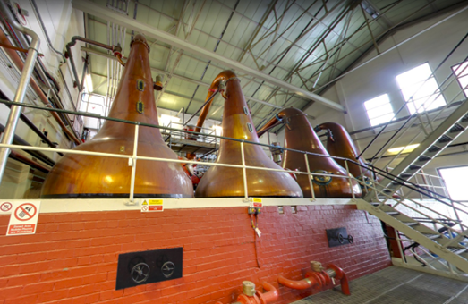 Sous un hangar lumineux les parois lisses de quatre alambics reflètent les lumières, ils sont posés sur une plateforme comme des poires géantes mordorées. Des panneaux noirs de commandes sont fixés dans un mur de briquettes rouges brillantes en contrebas. Des tuyaux de différentes grosseurs et couleurs filent le long des murs et du plafond, un escaliers de métal dessert la plateforme avant de bifurquer en sens contraire vers les étages