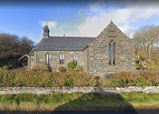 Bâtisse de grosses pierres grises aux murs percés de hautes fenêtres en ogives, massive et austère, style néo indifférencié avec petit clocher à deux pointes. Un muret bas et large devant une haie taillée sépare la propriété de la route. Sur la gauche une petite remise avec auvent et de l’autre côté dans le jardin une table en bois avec des bancs On ne vient plus prier ici, l’ancienne église s’est transformée en meublé charmant.
