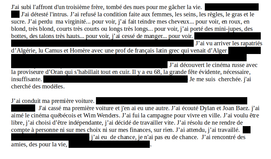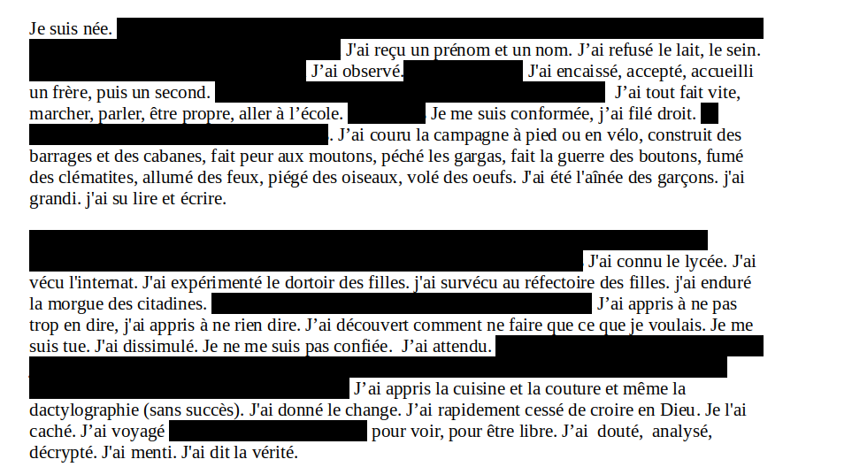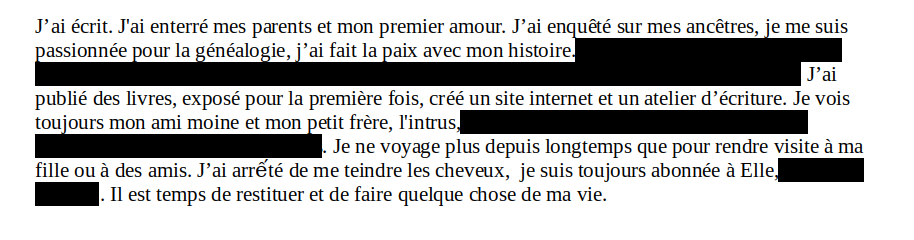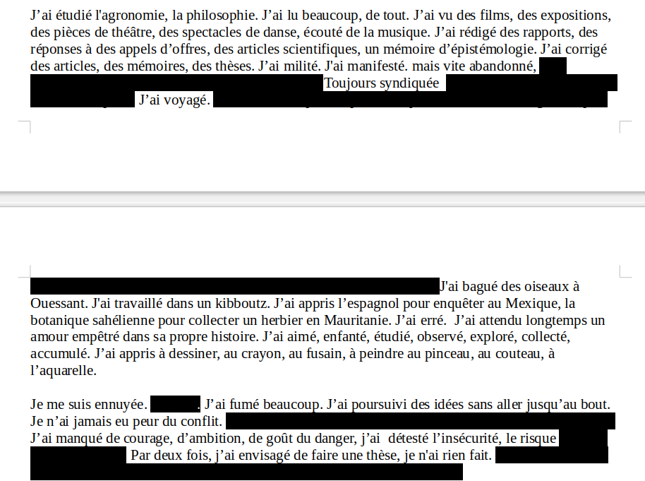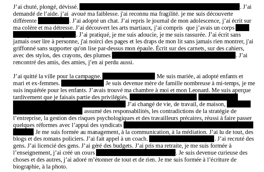 J’ai adoré cette presentation caviardee et je me suis demandé si ce n’était pas des versions differentes de la même vie avant de lire. On pourrait faire ça aussi en atelier. Alors en vous lisant vraiment, je suis eberluee : vous avez eu plusieurs vies et chacune bien riche. Très jolie présentation à travers ces textes réussis. Merci