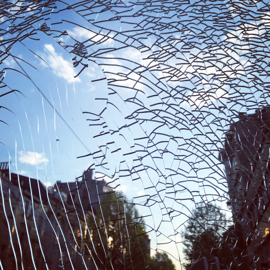 L’autre jour, à l’arrêt où elle a attendu le bus pour se rendre dans le centre-ville, une des parois en verre de l’abribus était brisée en myriade d’éclats sans qu’aucun d’eux ne se soit dissocié du châssis ou de la plaque elle-même. Elle s’est dit que ce genre de vitre devait être doté d’un film de protection permettant d’éviter qu’en cas de bris les morceaux se détachent partiellement ou se répandent au sol risquant d’occasionner des blessures. Elle s’est approchée. Devant ses yeux se dessinait toute une géographie de fragments disparates, comme savamment juxtaposés pour former une mosaïque où le soleil venait buter et repartir dans toutes les directions. Au plus près, les bords irréguliers des tessons, à certains endroits, ressemblaient à un enchevêtrement de fils de couleur grise pareil à une trame de métal aux arabesques géométriques qui lui évoquaient des têtes d’oiseaux, des parties de visages, de face ou de profil, des yeux, des bouches ou encore des écailles de poissons, des boomerangs, des cerfs-volants, des oiseaux qui traversent le ciel matinal ; à d’autres leur orientation les transformait en miroirs de quelques millimètres de largeur reflétant en forme longiligne les bâtiments alentour. Elle s’est dit que seul un œil myope comme le sien pouvait percevoir ce genre de détail. Quant à l’ensemble lui-même, il offrait une image fractionnée dont chaque pièce, disjointe, constitue une image à part entière comme celle, isolée de ses voisines, où l’on aperçoit une forme ovoïde en verre dépoli surmontée d’une sorte de tiare ajourée de couleur sombre avec à son sommet un petit rectangle sombre également. Les deux morceaux de verre juste au dessus montrent que l’ovoïde est attaché à ce qu’on devine être un câble lui-même arrimé à une surface verticale se découpant sur fond de ciel bleu. Côté opposé de la représentation ainsi créée par la plaque de verre éclatée, d’autres bâtisses à contre-jour, dans les fenêtres desquelles vient briller un soleil naissant orangé et doré, sont parcourues, comme découpées, par les stries ondulées des brisures du verre où miroitent le bleu du ciel et les nuages.