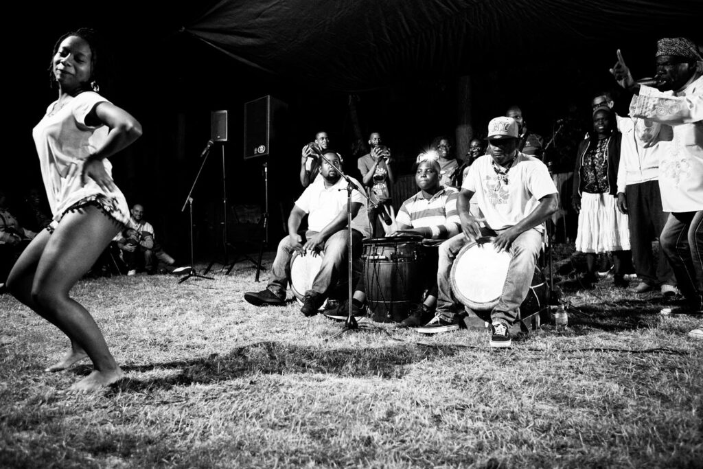Je t’explique avec 4. Pour t’expliquer avec 4, il faut que je t’explique avec 6 minimum parce que tout commence, en vrai, avec la voix du chanteur avant les tambour boula. Le chanteur chante. Il donne le rythme. Il y a 7 rythmes. Le toumblak est joyeux. C’est celui que je préfère danser. Le mendé donne la force. C’est le rythme de carnaval, il faut nous laisser passer, rien ne peut nous arrêter. Il y a ensuite le kaladja, la tristesse, la mélancolie et la souffrance, le padjembel, le woulé, sont des rythmes de travail, le graj c’est l’amour, et pour finir le lewoz, plus martial. Le chanteur donne la couleur. Il appellent ensuite les répondeurs qui lui répondent. Quand les répondeurs ont répondu, il appelle alors les tambours. C’est seulement alors que les 2 boulas commencent à battre. Tout est alors prêt pour que le marqueur rentre en scène. Marquer c’est improviser en s’appuyant sur le rythme des 2 boulas, en restant bien dans les cordeaux fixés par les boulas qui encadrent le marqueur. Le tambour du marqueur est debout alors que les 2 boula sont couchés. La danseuse ou le danseur viennent après toute cette installation, cette imbrication de rituel, dans le rituel. Chacun aura son moment, chacun est digne d’être entendu. Chacun a voix au chapitre. Il n’y a pas d’anarchie. Je vais sentir le moment où je pourrai rentrer dans la ronde face au marqueur devant eux 3. Ils ne sont pas là pour me juger. J’ai pourtant une appréhension avant de me lancer. Comme pour monter dans le carrousel, il me faut sentir le mouvement. Le regard est mon ancrage. Je capte le regard du marqueur et nous ne nous quitterons plus des yeux. Il n’aura pas besoin de regarder mon corps, de regarder mes pieds. Nous serons arrimés par les yeux et il me suivra, parce que c’est à mon tour de parler. C’est à mon tour d’avoir voix au chapitre. Les battements de son tambour vont ponctuer chacun de mes pas. Mes pas deviennent son et coup de tambour. Mes coups de reins sont des coups de tambour. Bidim, bidim, bo! Bouk tak, bouk tak, boudouboutak … Nous avons pour nous entendre des règles. La première c’est que je dois rentrer dans la ronde et faire une reprise, c’est à dire un tour sur moi même en restant dans le rythme. La deuxième règle c’est que pour lui indiquer que je vais changer de pas de danse, je fais un déboulé, c’est à dire que je répète mes pas de manière plus précipitée ce qui lui indiquera que je m’apprête à faire une reprise, un tour sur moi même et à changer de pas. Je n’ai pas le droit de changer de rythme. Personne d’ailleurs. Le jeu est de ne pas décrocher du regard et surtout ne pas perdre le rythme et tomber dans le canal. Quand on est un danseur et un marqueur averti, on peut jouer à se surprendre, on peut jouer à s’affronter, par des accélérations, ou des ralentissements presque qu’imperceptibles, mais à la fin c’est un ouvrage, fait main et pied, fait corps à deux avec le soutien des 2 boulas qui performent par leur constance de métronome.