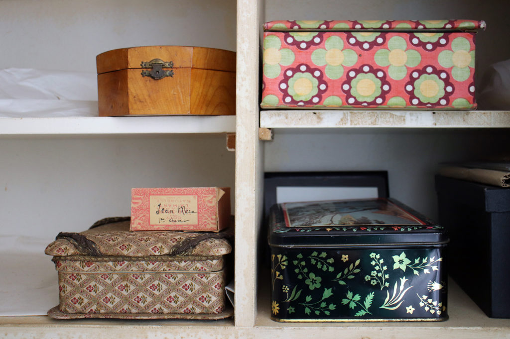 Dans l’armoire du cabinet de toilette de la chambre du bas toutes sortes de boîtes, en bois, en métal imprimé, recouvertes de tissu fleuri. La plus petite, en carton fragile, qui contenait à l’origine un poudrier, porte une mention manuscrite : J-M, premiers cheveux.