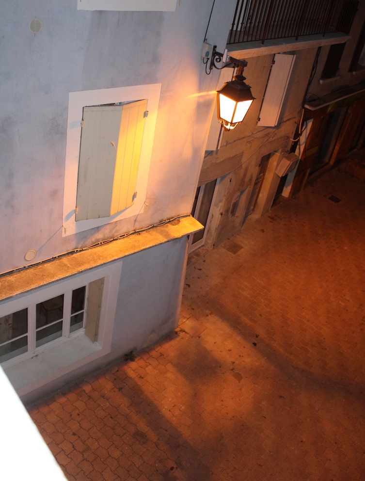 Il souligne encore le petit air italien de la place – dont la nuit pourtant éteint l’ocre des façades, rouge mat, orangé pâle, jaune ou rose clair, les volets verts, bleu turquoise fané, marron – et sa tonalité festive avec les vitrines joyeuses de tissus, de vaisselle, de petit mobilier ; il vide l’endroit de ses bruits diurnes, de ses rires, des pas des touristes, de leurs vagabondages, de l’agitation des marchés, il impose le silence ; dans son halo, on se tait, on marche tête baissée, sans souvenirs du jour, on ne voit plus que ce qu’il nous montre, le clair-obscur, l’envers du décor et ses modelés, il nous épargne nos peurs nocturnes, mais il ne peut rien contre les odeurs étouffées, ramassées, d’une foule de vacanciers mêlée à celles de la savonnerie du coin de la rue ou aux effluves de la distillerie derrière le pâté de maisons, qui s’épanouissent sur la place dans la paix de la nuit.