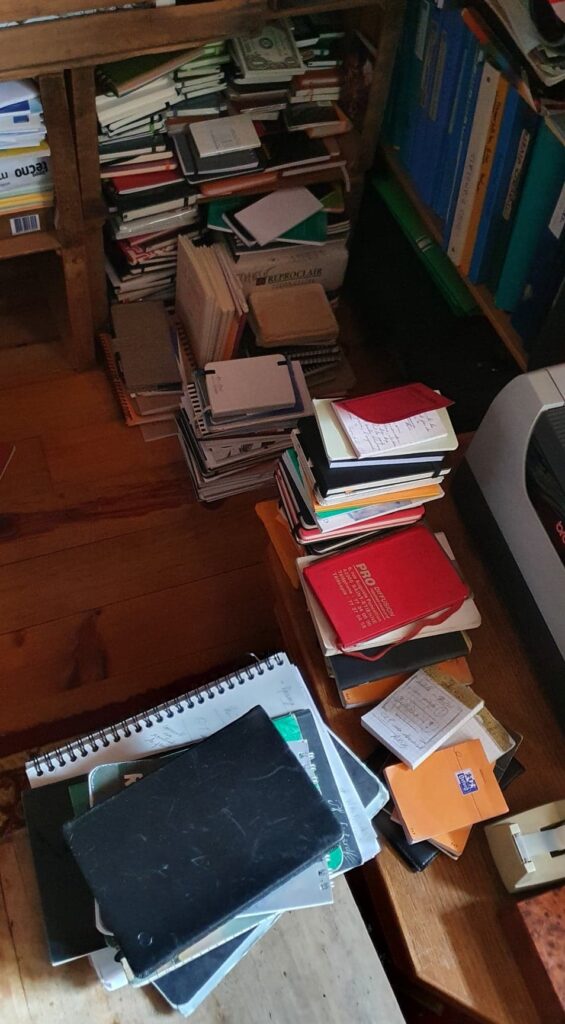 ils ne sont pas tous remplis Brigitte, certains oui, d’autres commencés, un peu comme dans la vidéo de François. Il y en a où ce ne sont que des notes, certains ont toutes leurs pages, d’autres pas, certaines sont numérotées, la plupart non; il y en a qui portent une date mais parfois non.