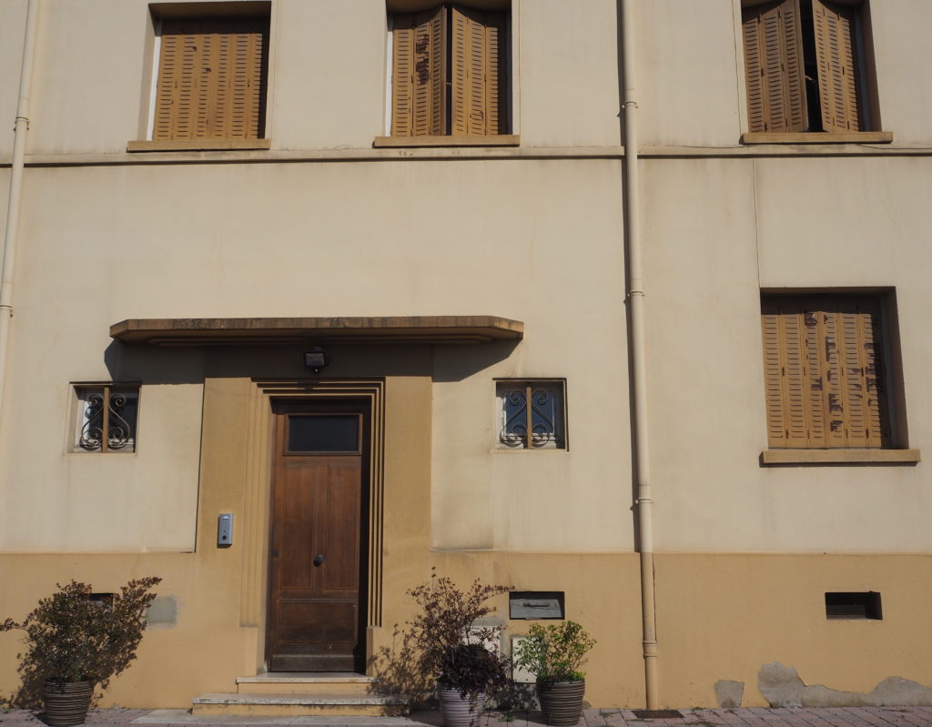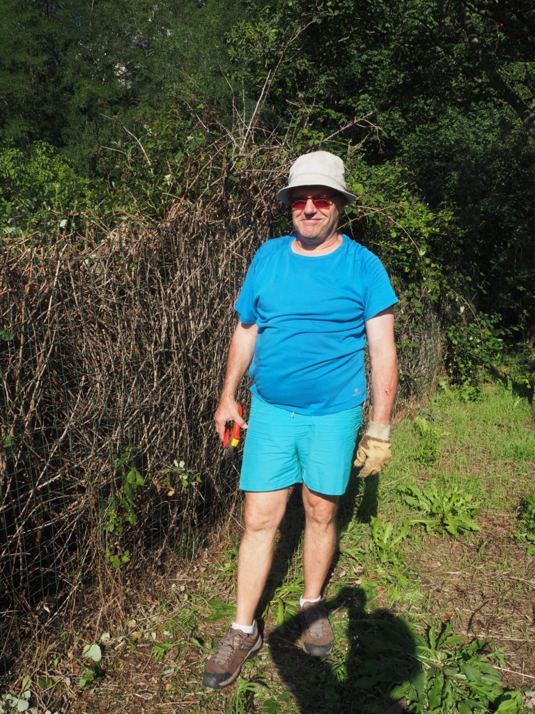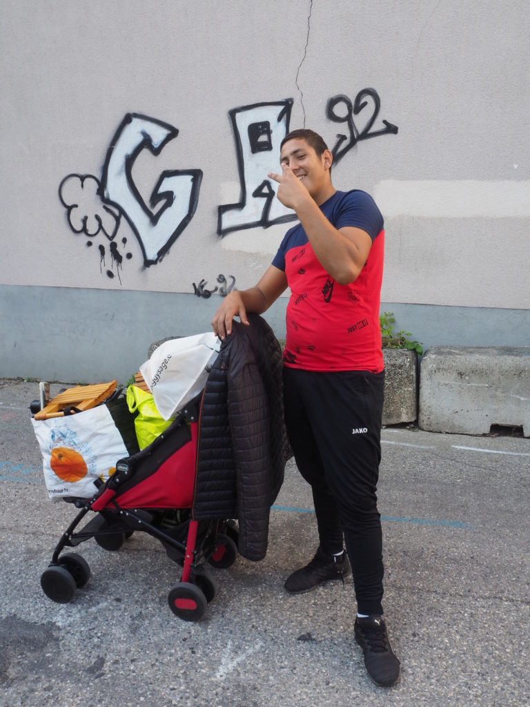 Elle descend à Mouillard, c’est le nom de la rue qui passe en dessous et à laquelle on accède par une rampe aménagée d’un côté, par une sente créée par les usagers de l’autre. On domine l’emprise SNCF, son jeu de boules, son centre de formation et d’autres bâtiments interdits d’accès. Un homme taille la haie de ronces, pour s’occuper dit-il. Avec le soleil du matin, on voit son ombre sur la photo, tant pis ! elle ne recardera pas. Deux garçons sortent du bus avec des caddies pleins d’objets (un déménagement sans doute); l’un des deux réclame une photo qu’elle prend avec plaisir, en rouge devant des tags sur un mur blanc.