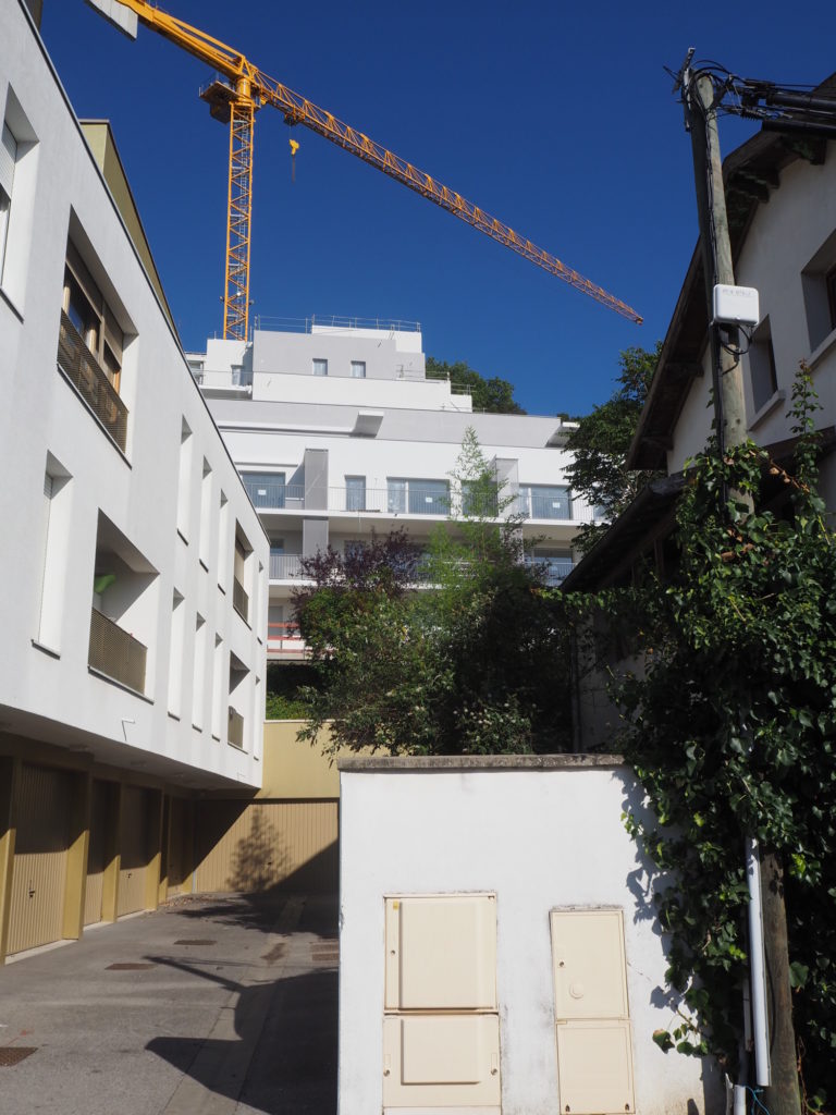 Vieux bâtiments, réhabilitation, constructions neuves genre résidences privées (dans la pente où trois villas ont été démolies) ou genre OPAC, la rue et la pente se transforment. « Où tous ces gens se gareront-ils ? Et la pente tiendra-t-elle ? » demande le tailleur de haie. On n’est pas loin de l’aplomb des deux tunnels, celui du bus et celui du périphérique Nord, mais le coupeur de ronces est trop jeune pour se souvenir de la catastrophe de Fourvière en 1930 (40 morts dans l’effondrement d’un pan de la colline) . Peut-être voleront-ils comme Louis Mouillard (1834-1897) qui s’est jeté des tours de Fourvière pour tester ses conceptions du vol sur le modèle des oiseaux ? Le sacristain l’a retenu ; Louis Mouillard a une stèle à l’entrée de l’aéroport de Bron.