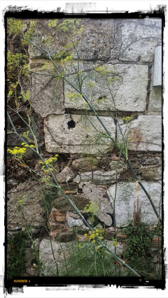 Pour fermer le L., l’ajout moins ancien d’un mur plus bas, formé quant à lui d’une base en pudding toujours, rehaussé de quatre rangées de pierres de tuffeau, variété crayeuse d’un tuf calcaire typique du ligérien. A l’arrondit du puits, la portion de mur derrière les hautes tiges de fenouils mêle pudding, tuffeau, briques et culs et goulots de bouteilles vertes, un mur rabouté, raccommodé. Deux culs de bouteilles et trois goulots, d’un vert sombre sous l’enduit, cinq bouteilles posées presque têtes bêches en travers du mur, chose fréquente à l’époque m’a dit le tailleur de pierre en riant – mais laquelle ? -, pour combler un espace, bouteilles et mortier. Fin de mur, fin de chantier, avec la fatigue dans les bras qui pèsent, avec le désir d’en finir et voilà que ça manque, ce qu’il faudrait pour terminer – un mauvais calcul ? Un moment d’inattention ? Un petit chantier après tout, un mur n’est pas une maison ni un entourage de porte ou de fenêtre en lourdes pierres de tuffeau qui font parement et couronne, ni une corniche dont les pierres ont la particularité de leur énormité pour être et du mur et de l’encorbellement, un décroché sous la gouttière, au ras du toit, si lourdes celles-là qu’il faut un treuil pour les hisser et gare s’il en manque, ça ne se raboute pas une corniche ; mais un bête mur de délimitation entre ce qui est à toi et à lui, qui ferme les propriétés, qui coupe ce qui fut un grand terrain, créant le clos du jardin, et pour en finir de ce chantier, prendre ce qu’il y a sous la main, les cinq bouteilles bues ce jour-là, cette pierre de tuffeau, les briques et quelques éclats d’ardoises au-dessous pour l’alignement, et hop qu’on en finisse.
