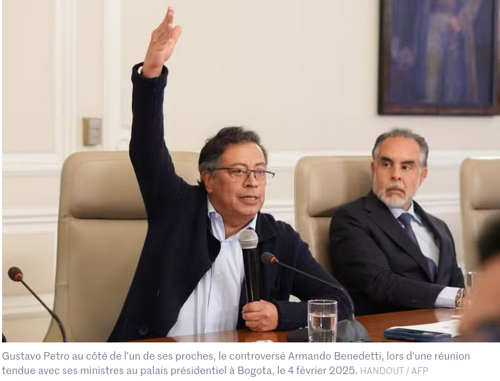 le regard du type à droite – l’Armandi Benedetti soupçonné de viol et autres turpitudes plus ou moins sexuelles : les femmes du gouvernement de ce Gustavo Petro ont par solidarité démissionné, ne voulant pas de ce type à leurs côtés – ce qui fait que le Gustavo en question a demandé (obligé) tout son gouvernement (sauf son chouchou Benedetti) à démissionner – c’est vrai que ça fait poubelle et compagnie, mais est-ce monté de toutes pièces ? Afin de foutre en cette poubelle ce Gustavo et son Armando ? Qui instrumentalise qui ? Et regarder, comme le journaliste moyen, compter les coups les points les avancées comme les reculades, est-ce que ça n’a pas quelque chose d’un peu dégueulasse ? Mais sinon, serait-ce simplement tu ?