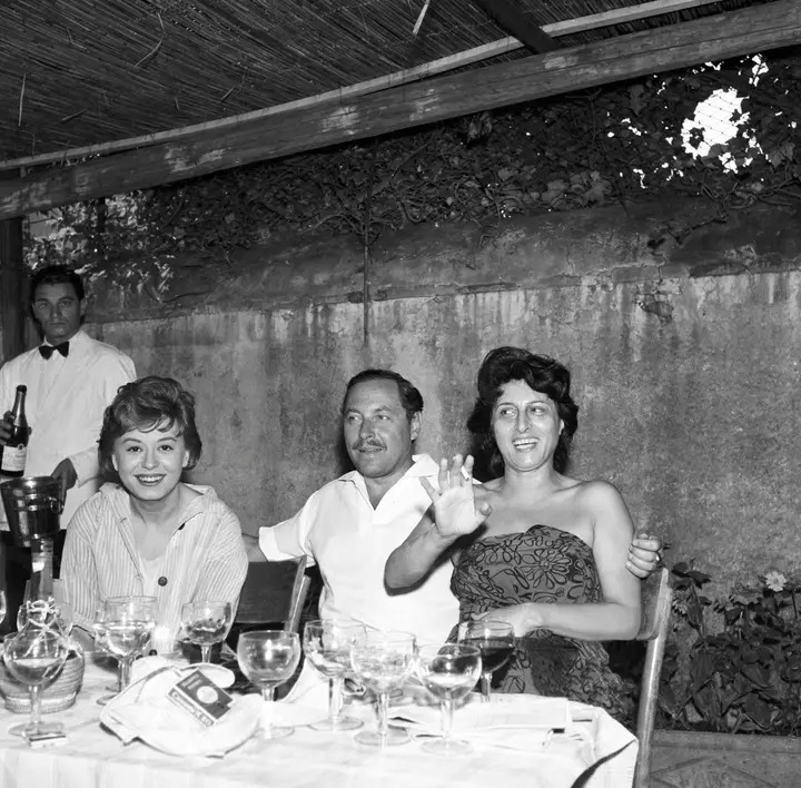 j’arrivai pas à dormir (elles étaient là, elle 15 mois, Saëlle, sa mère dans la chambre du fond Loïta) et je faisais un intermède du style compter les moutons – drôle d’idée… – des égéries (à cause de cette photo – années 50) (je ne connais pas le type au nœud’pap qui fait le service (mais il ressemble à Jack Palance (Jimmy Prokosch), le prod de Le mépris), assise Giulietta Massina (Juliette des esprits); Tenessee Williams et Anna Magnani) (un paquet de craven A bout liège plus une bonne dizaine de verres à pied)