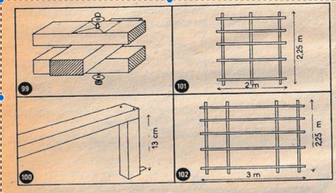 Les tasseaux de bois blanc de 50x30mm sont fixés entre eux par des tiges filetées de 8x110mm. Celles-ci sont maintenues de chaque côté par des boulons à tête diamant pour le devant et ordinaires côté mur. Ne pas oublier les rondelles contre le bois. Chaque montant vertical est maintenu par deux équerres coudées sur tranche de 40x40mm (et leurs vis), une pour le sol et une pour le mur. Pour fixer les morceaux de tasseau de 13cm aux montant verticaux, il faut des pointes de 2,7x60mm, deux par montant. Pour poncer, du papier abrasif 0,00. De la peinture ou du vernis selon vos goûts.