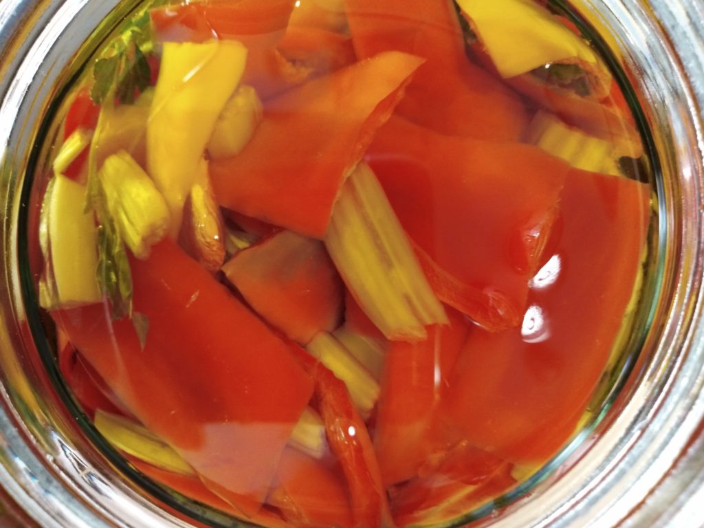 Les poivrons découpés, mis à dégorger dans une passoire avec du sel puis disposés sur un torchon afin qu’ils sèchent avant d’être placés dans l’huile : moisis en une nuit.
