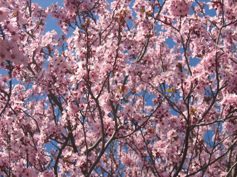 Un gros nuage rose tendre au-dessus de moi, de ma tête, de ma table, de mon bout de jardin. Des bourgeons éclatants de sève et de douceur. Des fleurs soyeuses, aériennes, tremblotantes, accrochées sur les rameaux noirs finement torsadés. Un nuage rose laissant traverser le bleu du ciel par des espaces dentelés. L’arbre est bien ancré dans mon bout de jardin, s’épanouit un peu plus chaque année, domine le paysage que j’aperçois à travers ses branches. Rivière aux eaux vertes serpentant en tourbillons dans des gorges escarpées, prés vert tendre, vignes en devenir, couronnes de falaises blanches tourmentées. Parfois une pluie de pétales roses sur ma table du petit déjeuner et des abeilles qui butinent en bourdonnant. C’est le printemps.