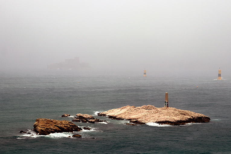 On revenait à Marseille pour une semaine, c’était l’automne, on avait loué un appartement sur la corniche Kennedy, à la sortie de l’anse de Malmousque, face à la mer, avec une de ces loggias vitrées qu’on trouve souvent par ici. On n’avait pas imaginé que ce serait un tel saisissement, une telle lumière, ni que le Frioul serait juste en face. L’idée d’une série photographique s’est imposée d’emblée, avec pour seule intention saisir les mouvements du ciel, les changements de lumière sur la mer, faire le plus d’images possibles dans les temps vacants. Dans la véranda il y a une table haute, l’appareil entre les mains j’y pose mes coudes, je cadre. Ce n’est pas le cadre idéal, la proportion de mer est trop importante, l’archipel un peu coincé sur les bords, l’horizon disparait derrière les îles. Pourtant je me refuse à réduire la focale, à reculer la table trop lourde, à surélever l’appareil, je renonce à composer davantage, je fais glisser la baie vitrée et prends une première photo. Durant la semaine que dure le séjour je fais environ cent cinquante images, je déclenche, jusqu’à trente fois par jour. Les premiers jours il pleut beaucoup, je me réjouis d’être prisonnière de la loggia, de la table haute, de mon 50 mm. Quand finalement le temps se lève, nous invite aux promenades en famille, quand nous marchons dans la ville, je pense à la véranda, la chaleur qui s’y accumule, la table haute, aux îles qui m’attendent, il m’arrive de précipiter certains retours pour saisir la lumière dorée de fin de journée, le déploiement des nuages au-dessus du couchant. Et le vol des oiseaux de mers, les ombres, les passages des ferries, le nageur imprudent, la nuit — le temps s’écoule, je ne cherche pas à l’arrêter. J’ai mémorisé la hauteur de l’horizon, je sais où s’installent phares et balises. Si je me réveille dans la nuit je m’approche de la table, reprends le rituel, faisant glisser silencieusement la baie pour ne réveiller personne, tentant de discerner les masses des îles pour respecter le cadre. Dans la répétition du geste, l’immobilité du cadre, un espace s’ouvre, un flottement, j’accueille d’autres images, d’autres paysages, les souvenirs viennent s’imprimer sur une matière qui se dérobe, j’écris.
