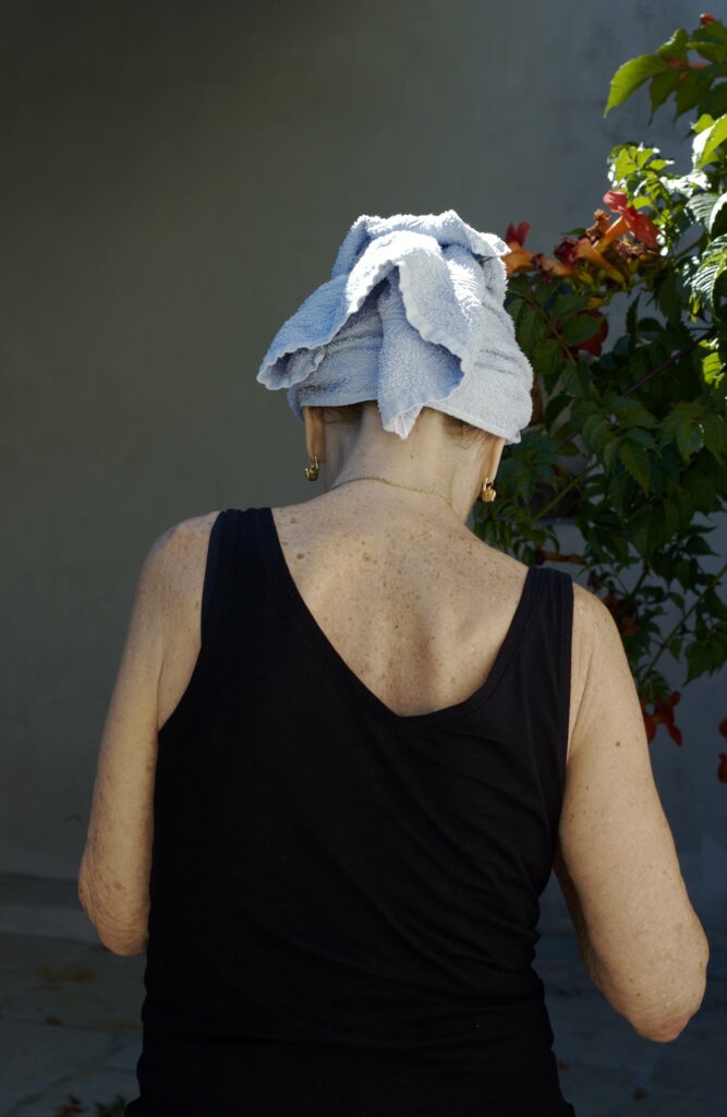 Un livre, un téléphone. Une chose assez petite l’absorbe. Elle s’est lavé les cheveux. Elle a noué une serviette autour de ses cheveux mouillés et c’est un turban qui bleuit dans la lumière, un arrangement involontaire presque savant; ce petit pan d’étoffe qui pend (la surexposition juste au dessus, cet éclat sans matière qui dénote les failles techniques). Tu n’es pas photographe tu prends des notes, tu gardes traces. L’orange des fleurs. (la bignone pousse comme le chiendent). Les taches sur la peau: taches de rousseur et fleurs de cimetière. Ces heures que nous partageons: l’extrême proche. Elle me parlera tout à l’heure du livre que je lui ai prêté ( mon père et ma mère d’Appelfeld). Je lui dirai plus tard pour cette image d’elle que j’ai faite. Vermeer c’est avec elle et avec lui dans le musée de La Haye que je l’avais vue : la fille au turban qui a une perle à l’oreille. Longtemps.