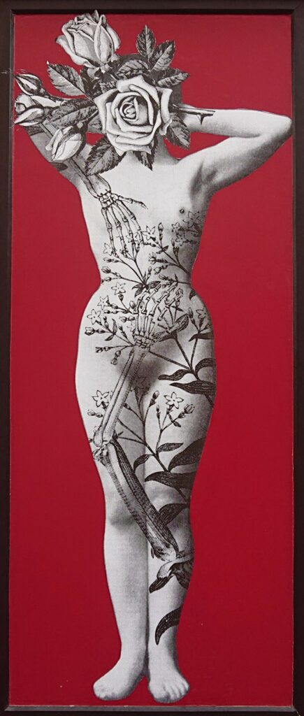 Un corps de femme aux bras repliés derrière la tête, à la peau claire en grande partie recouverte de dessins floraux avec aussi deux fines mains de squelette, l’une sur le sein droit de ce corps au bassin rond, aux jambes plantureuses que l’ossature d’un long bras traverse en diagonale pour aller déposer la seconde main de mort sur l’arrondi du ventre, un corps dont le visage est caché par une énorme rose aux pétales épanouis tandis que les cheveux et le bras droit disparaissent derrière des feuilles, des épines, des boutons de rose et que le bras gauche, relevé sous la nuque, dévoile les ombres d’une aisselle et un petit sein rond.