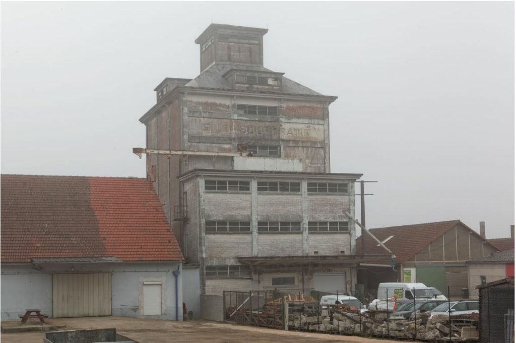 Hors de l’immensité des champs qui s’étalent de l’autre côté de la route, hirsutes après la moisson. Structure métallique rouillée, remplage de briques, inscriptions affadies. A peine distingue-t-il le mot SILO en lettres majuscules au pochoir. Bâtiment industriel de cubes empilés. Au faîte: un campanile raccourci. Vieux silo à démolir, lieu du fait-divers. Le photographe devine ce qu’on voit de là-haut, des étroites fenêtres du silo, fentes allongées presque de casemates, lui qui au bord de la nationale ajuste le trépied, visse l’appareil sous l’œil curieux des automobilistes freinant au niveau du feu. Il devine la voie ferrée longeant derrière, le raffut des trains de fret, interminables comme ceux d’aujourd’hui dont deux déjà ont fracassé le silence. Des champs, des champs, des champs qui se vidaient, venu l’été, dans le ventre du vieux silo. Des clochers, des villages serrés autour comme troupeaux apeurés. Il cadre non pas de face mais légèrement d’angle pour le volume. Les deux amis du fait-divers, il a lu leur histoire. Ouvriers agricoles, agents de silo. La ferme paternelle donnée au frère marié du premier ouvrier, qui a dit qu’il préférait, pour le salaire, travailler au silo. Le photographe a lu ça dans la presse régionale de l’époque. Hors-champ, les lourds wagons freinent sur les rails. Mais l’ouvrier, au silo, avait un ami. Grincements. Tonnes de grains versés dans le ventre du silo. Deux amis plus frères que des frères, travaillaient au silo, là où l’un a vu l’autre tomber et disparaître, aspiré dans les grains. Pour sa prise de vue, le photographe attend une accalmie du flot des bagnoles glissant l’une après l’autre dans le champ. A vu son ami déraper, tomber, s’étouffer dans les grains. En contre-champ, la Loire coule ses eaux torturées sous le pont médiéval. A vu mourir l’ami plus frère qu’un frère. Pris de folie s’est enfui du silo, s’est précipité vers le fleuve hurlant un long cri ou bien c’était le freinage des wagons-trémies sur les rails, ce cri aigu à en perdre l’ouïe. Le matériel replié, rangé dans le coffre de la voiture, le photographe démarre sans un regard pour le fleuve à main gauche. Bifurque. La maison du suicidé est à quelques kilomètres au milieu des champs, invisible de la nationale.