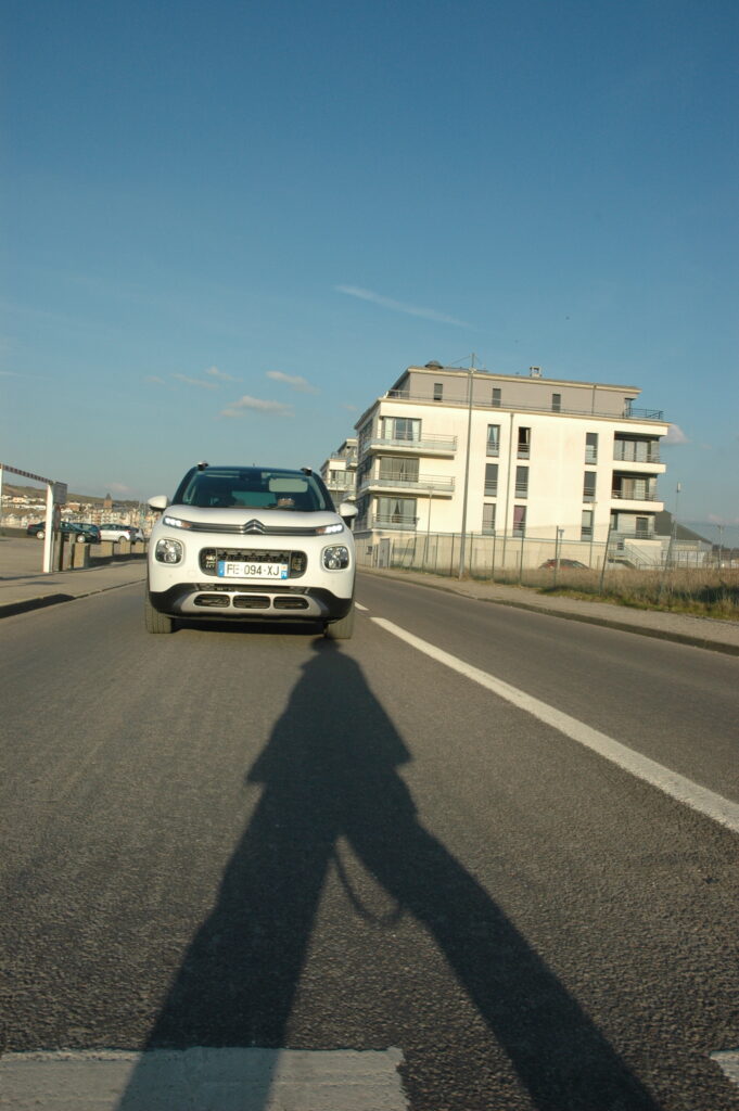 Après-midi de printemps finissant dans un soleil déjà glissant vers l’horizon..J’ai déambulé, la sangle de l’appareil photo enroulée autour de la main, dans les sinuosités des sentes et venelles de cette bourgade languissante du bord de mer. Pourquoi suis-je venu ici aujourd’hui? Par désir soudain de quitter la ville pour me rendre sur le littoral normand, que j’affectionne particulièrement à la morte saison. Nikon pré-réglé dans une main, téléphone portable en mode vibreur dans une poche, je furète ici et là, saisissant sur le vif les personnes entrevues et les ambiances ressenties dans les recoins de rues. Tout ce qui est banal, insignifiant est digne d’être photographié à mes yeux. Il y a en moi un peu de Bernard Plossu, un photographe-écrivain de voyage, dont j’apprécie la pratique du décadrage et du flou. Urbain par passion et photographe de rue par nécessité, la main sûre et l’oeil exercé, je n’ai pas forcément besoin de regarder dans l’oeilleton de mon appareil pour fixer une scène…La photo de rue est l’école de la discrétion et du culot…Je n’ai rien d’un paparazzi…je n’aime ni l’indiscrétion, ni les planques et les traques. Le téléobjectif m’encombre et je ne compte que sur le hasard et l’insolite…jamais de calcul…je ne marche qu’à l’instinct. Je ne cherche que l’instant décisif qui déclenche un désir de cliché unique…pas de série photo non plus pour rattraper une image ratée. Je ne connais jamais d’avance le résultat de la photo. Je ne peux que l’imaginer, la subodorer mais cela reste toujours une surprise…bonne ou mauvaise, mon attente n’est jamais déçue. Mon humeur détermine le thème du jour qui fasse écho à mon état d’esprit. Je peux aussi bien photographier une foule anonyme qu’un quartier de ville désert. Cette journée n’avait pas été particulièrement inspirante. Perdu dans mes pensées, j’attendais machinalement de traverser le boulevard qui s’animait en cette fin d’après-midi, à une heure où les employés, les bureaux et les ateliers se séparent pour la nuit. Regardant à gauche puis à droite, j’apprécie mon ombre encastrée dans la chaussée, qui s’étire dans la perspective du boulevard jusqu’à la calandre d’une voiture qui ralentit pour me laisser passer. Le point de fuite de mon ombre dans cette rue en enfilade, la forme des lignes de marquage de la rue et la répartition des masses et des couleurs rendent un cliché potentiellement intéressant. Je traverse, mon appareil photo pendant le long de mon corps à hauteur de hanche, objectif grand ouvert sur la voiture. Le clac furtif du miroir que l’on escamote, renvoie l’image de la scène vers le capteur, dans un ultime clin d’oeil à l’automobiliste, dont on aperçoit à peine le visage derrière son pare-soleil rabattu. Qu’espérais-je de cette photo? L’aspect technique du cadrage et de l’exposition ne me préoccupait pas outre mesure car les divers réglages de mon appareil n’ont plus de secrets pour moi. Ce que je souhaitais, c’était d’obtenir une exagération des lignes et des volumes et que mon ombre portée s’encastre dans le pare-choc et déforme l’avant de la voiture. Eh bien non c’était raté…mon corps n’était pas au milieu du capot et mon ombre touchait à peine la roue de la voiture. Toutefois, l’écartement des jambes, le positionnement du corps m’a rappelé étrangement une sculpture de Giacometti. S’il n’y avait pas eu les vêtements, j’aurais pu être la copie de cette oeuvre. L’ombre de la voiture m’affuble d’un drôle de couvre-chef, tout en volumes, répartis vers l’avant, subtilement posé sur quelques cheveux de ma tête, dans un équilibre précaire, que ne semble pas perturber la démarche rapide, que j’ai engagée pour traverser la rue. D’autres regardeurs y verront autre chose. Moi, c’est la vision qui m’est venue immédiatement à l’esprit, sans doute alimentée par des réminiscences concernant la solide amitié unissant le photographe de rue Cartier Bresson au sculpteur Giacometti. Ce jour là, je devais être d’humeur surréaliste et je ne le savais pas jusqu’à ce que je prenne cette photographie.
