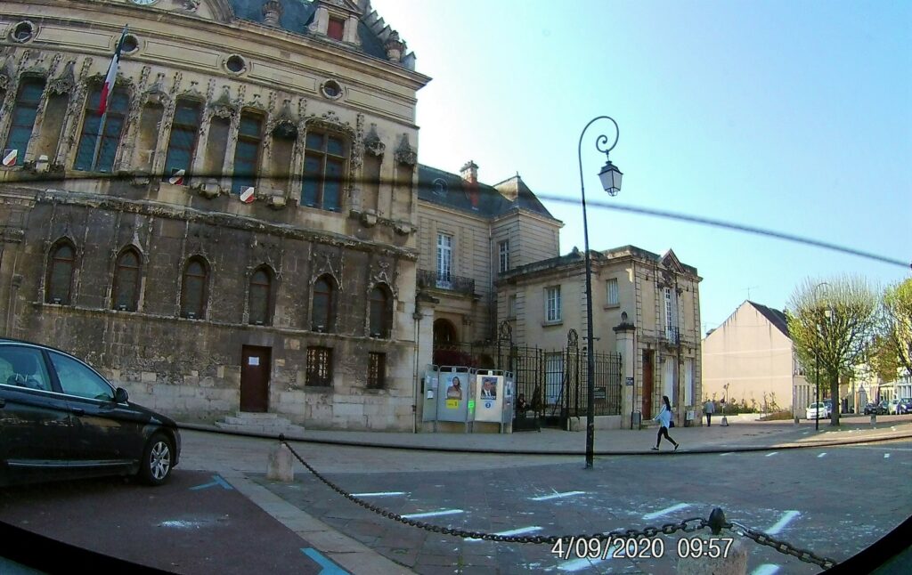 On vient d’en reprendre pour quinze jours, avec l’injonction réitérée de sortir de chez soi une heure par jour, mais sans s’éloigner de plus d’un kilomètre, sous peine de sanction, surtout si cette sortie n’est pas motivée par un besoin essentiel. Comme tout le monde, faute de pouvoir faire autrement, je me suis inventé une routine que je répête jour après jour. Je sors en voiture pour acheter une bricole dans une superette située dans le centre ville, distant de plus d’un kilomètre de chez moi. Il y a bien une épicerie sur le parcours mais par bravade, j’ai décidé de passer outre. Comme beaucoup, j’ai pensé à filmer et à photographier ce quotidien absurde, en m’inspirant de la comédie « Un jour sans fin » du réalisateur Harold Ramis, où le protagoniste Bill Murray, revit inlassablement la même journée. Après un passage par la gare, je marque une étape par la place de la mairie pour y faire des emplettes, pendant qu’un dispositif photo ou vidéo discret, placé sur la plage arrière ou avant de mon véhicule, filme ou photographie l’endroit en mon absence. Je me remets au hasard pour me livrer, des instantanés ou des morceaux de réalité, quI peuvent faire sens dans ces journées sans fin d’avril deux mille vingt. Tout cela fait un peu espion mais difficile de procéder différemment dans un contexte de suspicion et de surveillance généralisée, où le fait de photographier ou de filmer n’est pas considéré comme une activité essentielle. Etrange dispositif que l’on voit sur cette photo de la vitre arrière…Telle une pelote, un fil se déroule le long d’un véhicule noir, soulignant les poignées des portières, puis poursuit son périple, en gravant dans le sol un trottoir éphémère. Un autre fil courbe, tire et ploie l’édifice municipal comme pour l’arracher ou pour le coucher sur le sol. Ces deux fils sont soutenus par un réverbère fluet, qu’une chaîne métallique, délimitant le parking, vient tendre et renforcer. L’ensemble fait penser à une installation de cirque en plein air. Elle est montée, frêle silhouette bleue, au maintien altier, marchant droit devant elle, d’un pas assuré, sur un de ces fils placé au ras-du sol, sans l’aide de quiconque, sous le regard indifférent de candidats à des élections locales, qui ne lui prodiguent aucun encouragement pour cette prestation insolite. Peut-être la désapprouvent-elle puisque la marche sur un fil n’est pas considérée comme une activité essentielle. Enfin je présume. A t-elle réussi son parcours filaire? Sinon jusqu’où est-elle allée? A t-elle atteint le réverbère? Ou bien la voiture si elle a suivi scrupuleusement la courbe du fil? Je ne le saurai jamais car la photo suivante a été prise une minute après. On ne la voit plus mais le dispositif est toujours là. En ce neuf avril, un autre funambule a marché sur ce fil. Un jeune homme. Venant de la gauche, il a marché sur le même fil peu de temps après. Une ou deux minutes, pas plus, se sont écoulées depuis l’apparition de cette jeune femme. Etait-ce une coincidence ou bien devait-il la rencontrer sur ce fil en cet endroit précis? Si oui, de quoi allaient-il parler? Reviendra t-elle demain, par habitude ou comme moi, par routine? Une rencontre aura t-elle lieu? Et lui, reviendra t-il? Comme Bill Murray, je reviendrai sur cette place…un autre jour, semblable à celui-ci, mais pas tout à fait le même. D’infinies choses auront changé…La voiture ne sera peut-être pas au même emplacement, un peu trop avancée ou un peu trop en arrière, et je ne retrouverai probablement pas mon cirque et ses funambules aperçus la veille.