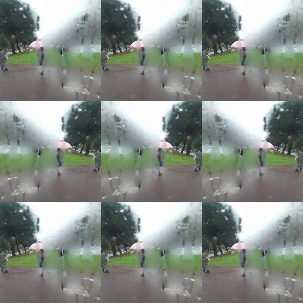 #14 | rien qu’une seconde | tiges coulissent déploient les toiles chatoyantes paysage colore têtes mouillées chaussures trempées deux trois silhouettes pas avant enjambée accélère court et disparait gouttes ricochent sur asphalte humide vol des feuilles brunes et ocre ronflement moteur couleurs s’effacent buée ruisselle soleil rayonne